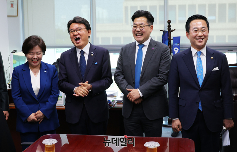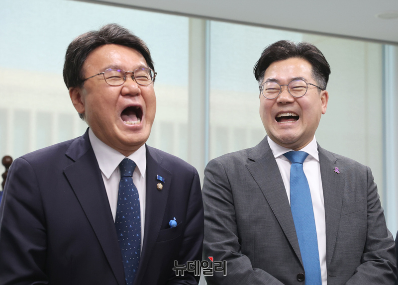 박찬대 더불어민주당 원내대표가 10일 오전 국회 의원회관에서 황운하 조국혁신당 원내대표를 예방하고 있다.