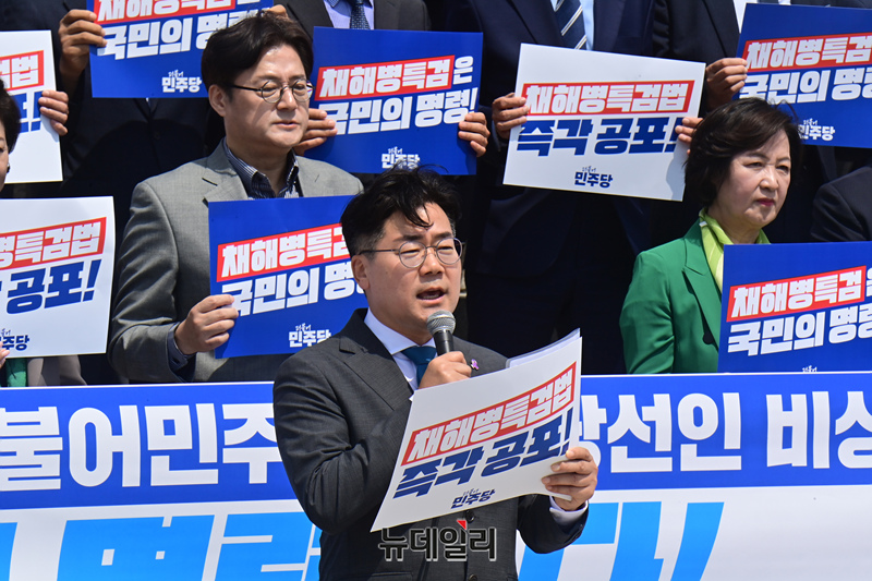 박찬대 더불어민주당 원내대표가 10일 오전 국회 본청 계단에서 '채해병 특검 관철을 위한 더불어민주당 초선당선인 비상행동 선포식'에 참석해 모두발언을 하고 있다.