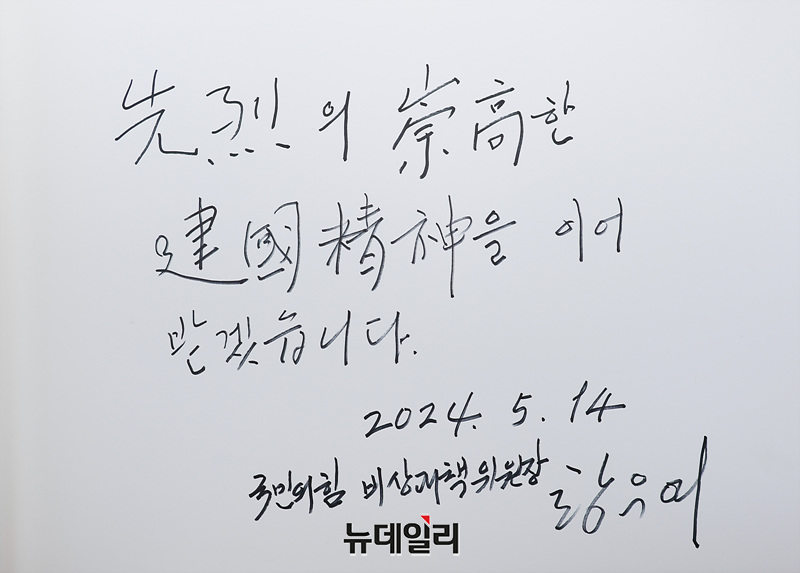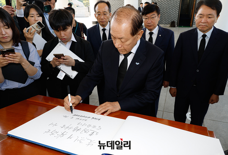 황우여 국민의힘 비상대책위원장이 14일 오전 서울 동작구 국립현충원에서 현충탑 참배를 마치고 방명록을 작성하고 있다.