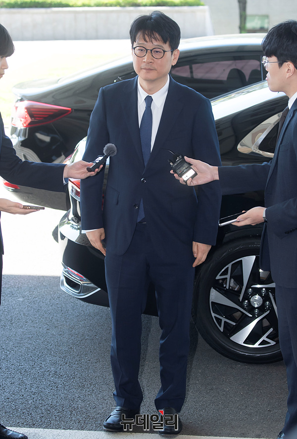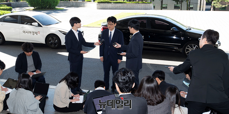 이창수 신임 서울중앙지검장이 16일 오전 서울 서초구 중앙지검에 첫 출근하며 취재진의 질문에 답하고 있다.