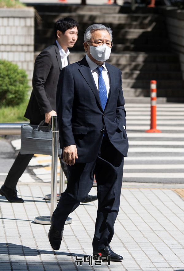 '대장동 50억 클럽' 의혹으로 기소된 박영수 전 특별검사가 16일 오전 서울 서초구 중앙지법에서 열린 '특정경제범죄가중처벌등에관한법률위반(수재 등) 등 혐의' 공판에 출석하고 있다.