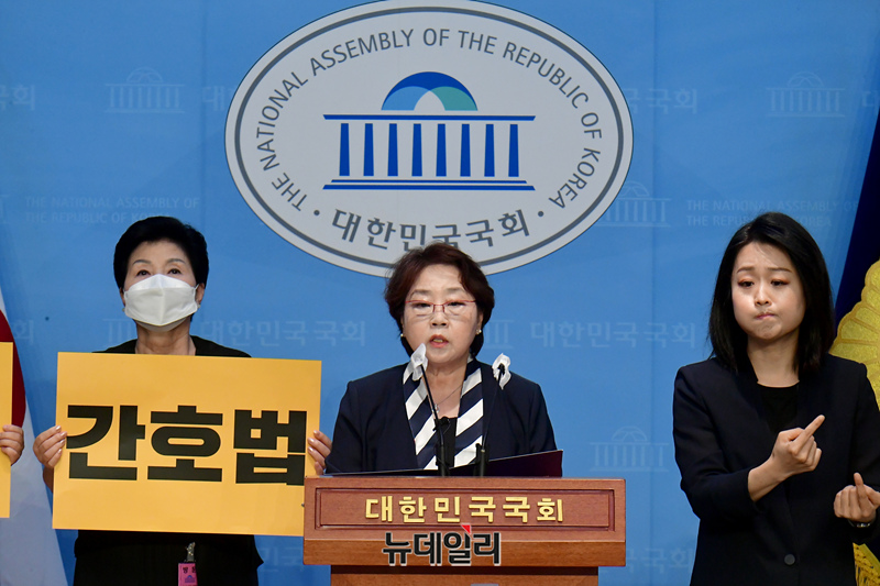 대한간호협회 관계자들이 20일 오전 국회 소통관에서 "간호사는 더 이상 티슈노동자일 수 없습니다"라며 21대 국회에서 간호법안 통과를 촉구하는 기자회견을 하고 있다.