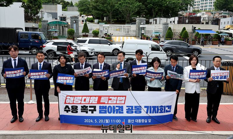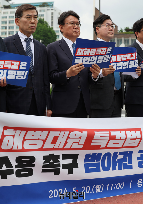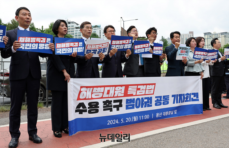 박찬대 더불어민주당 원내대표를 비롯한 범야권 원내대표들이 20일 오전 서울 용산구 대통령실 앞에서 채해병관련 특검을 촉구하는 공동 기자회견을 갖고 있다. 이들은 "윤석열 대통령이 21일 국무회의에서 특검 거부권(재의요구권)을 행사할 것으로 예상한다"며 채상병 특검법 수용을 촉구했다.