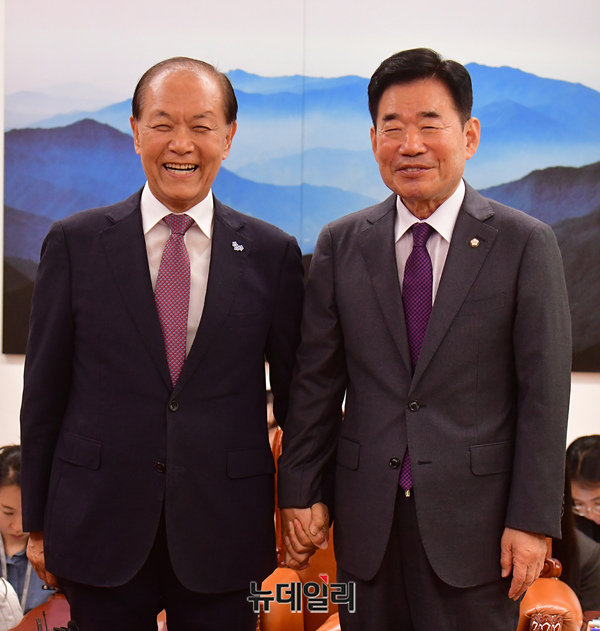 황우여 국민의힘 비상대책위원장이 20일 오전 국회에서 김진표 국회의장을 예방해 기념촬영을 하고 있다.