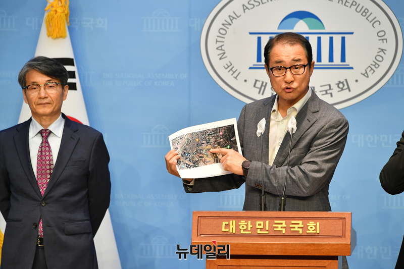 최재영 목사와 이성만 무소속 의원이 21일 오전 국회 소통관에서 열린 대통령실 앞 의문의 구조물에 대한 실체 규명 촉구 기자회견에서 발언하고 있다.