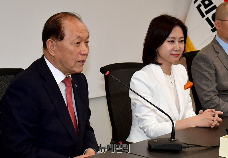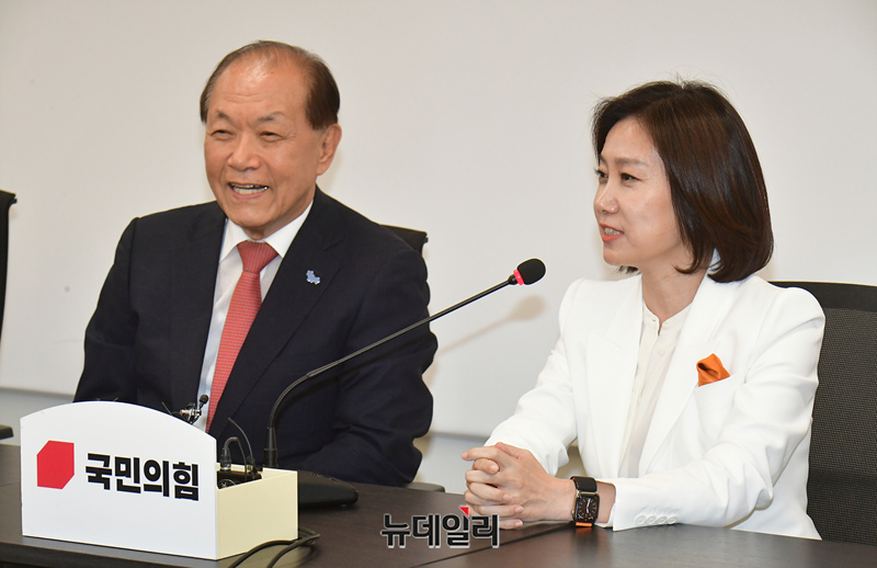 허은아 개혁신당 대표가 21일 오전 서울 여의도 국민의힘 중앙당사에서 황우여 비상대책위원장을 예방해 환담을 나누고 있다.