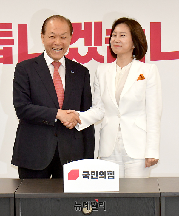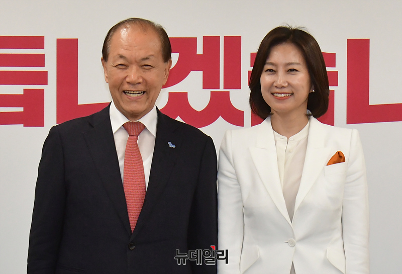 허은아 개혁신당 대표가 21일 오전 서울 여의도 국민의힘 중앙당사에서 황우여 비상대책위원장을 예방해 기념촬영을 하고 있다.