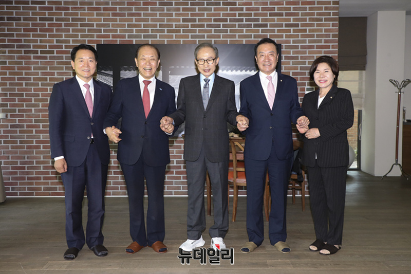 이명박 전 대통령이 21일 오후 서울 논현동 사저에서 황우여 국민의힘 비상대책위원장과 기념촬영을 하고 있다. (사진=국민의힘)