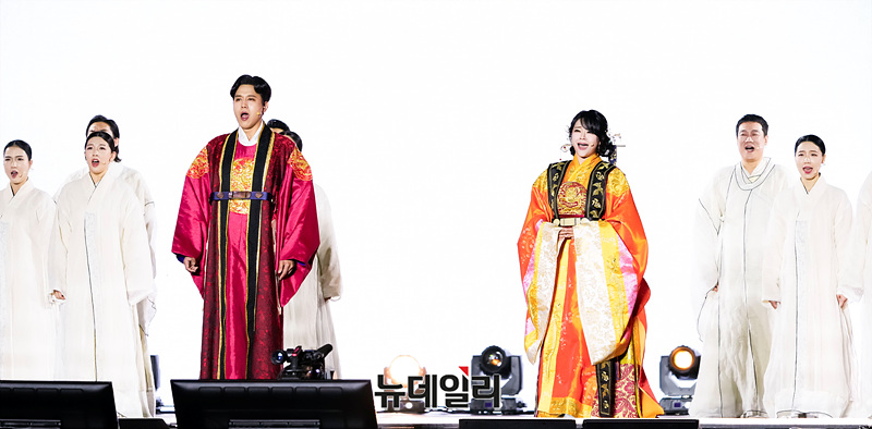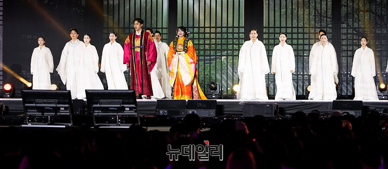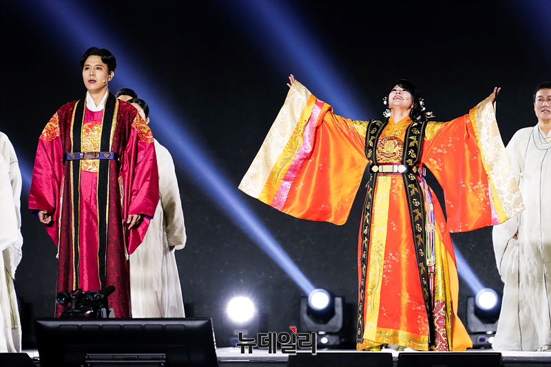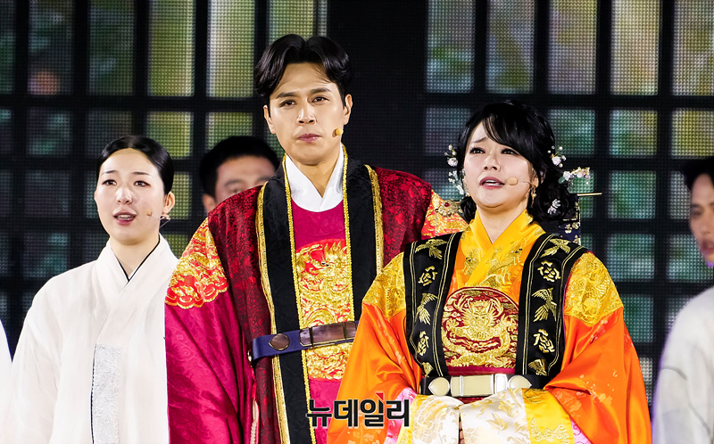 뮤지컬 '명성황후'팀 배우 김소현과 손준호가 21일 오후 서울 종로구 경복궁에서 열린 '코리아 온 스테이지' 공연에서 무대를 선보이고 있다.