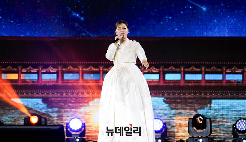 가수 송가인이 21일 오후 서울 종로구 경복궁에서 열린 '코리아 온 스테이지' 공연에서 무대를 선보이고 있다.
