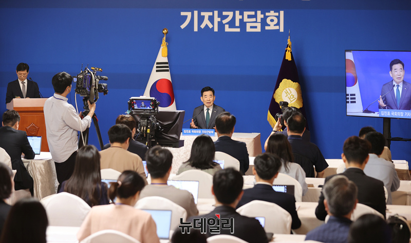 김진표 국회의장이 22일 오전 국회 사랑재에서 퇴임 기자간담회를 갖고 그간의 소회를 밝히고 있다. (사진=국회 사무처)