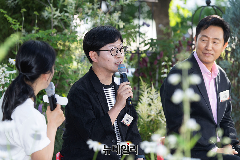 오세훈 서울특별시장과 유현준 건축가, 박원순 국립세종수목원 실장이 23일 오후 서울 광진구 뚝섬한강공원 피크닉무대에서 열린 '정원도시 서울 토크콘서트'에서 발언하고 있다.