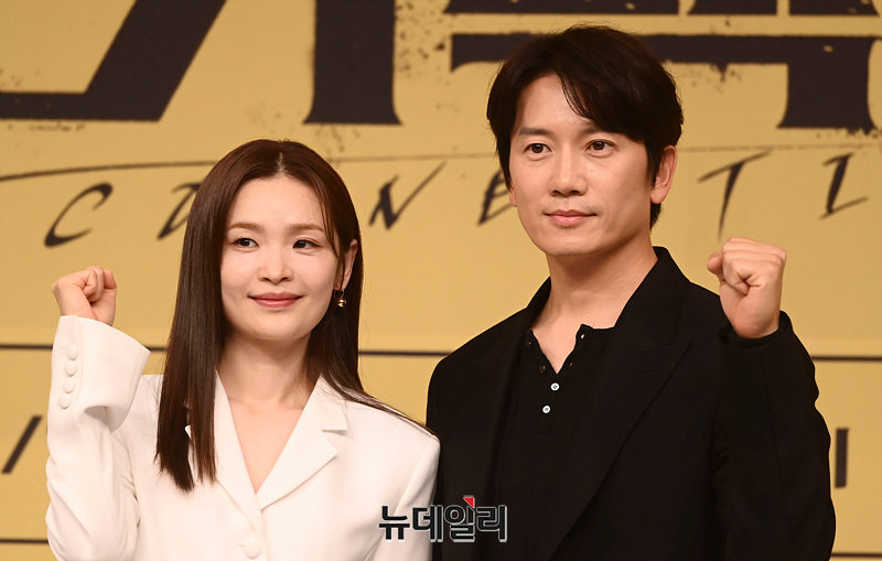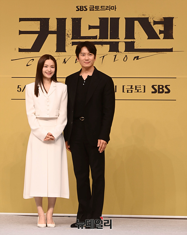 배우 전미도와 지성이 24일 오후 서울 SBS방송센터에서 열린 드라마 '커넥션(감독 김문교)' 제작발표회에서 포즈를 취하고 있다.