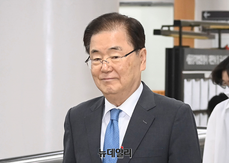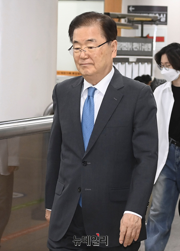 탈북어민을 강제 북송한 혐의를 받고 있는 정의용 전 국가안보실장이 27일 오전 서울 서초구 중앙지법에서 열린 '국가정보원법위반' 관련 공판에 출석하고 있다.