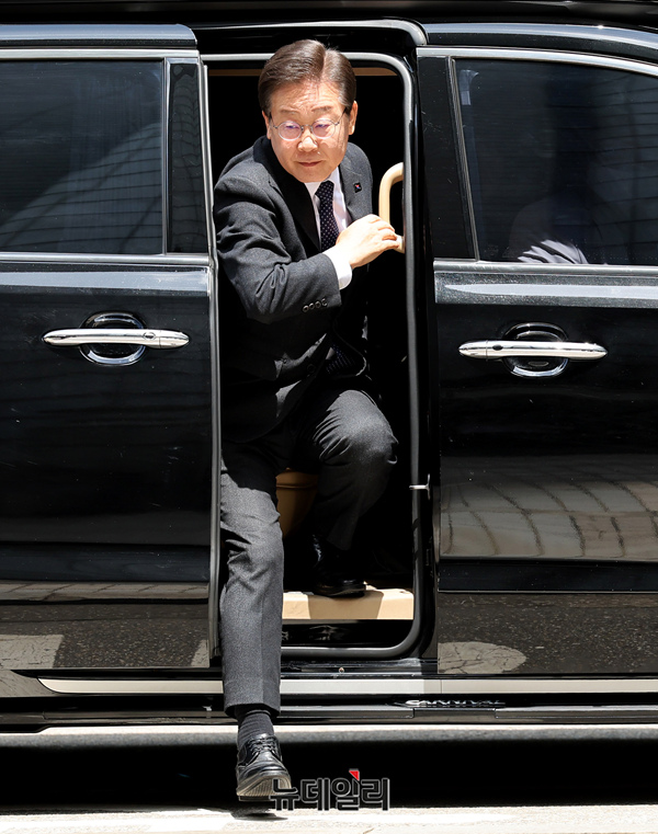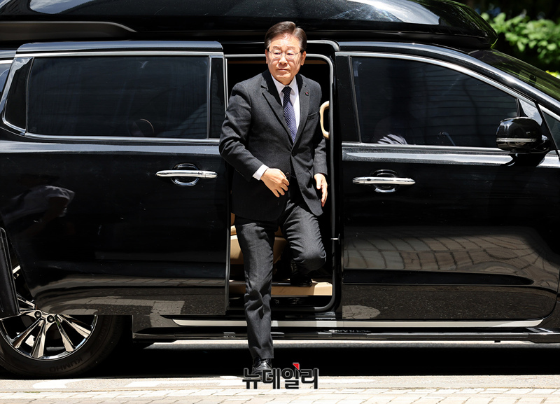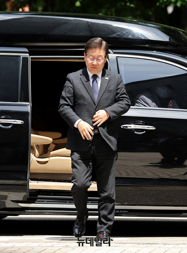 이재명 더불어민주당 대표가 27일 오후 서울 서초구 중앙지방법원에서 열린 '공직선거법 재판 위증교사 의혹' 1심 속행 공판에 출석하기 위해 차량에서 내리고 있다.