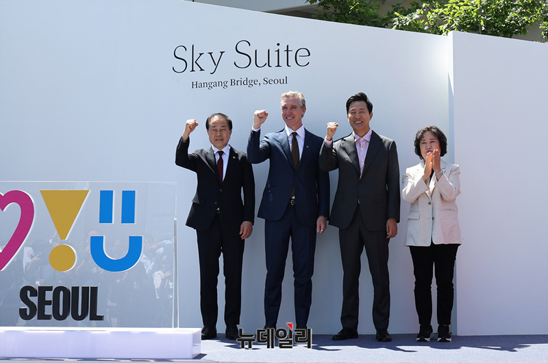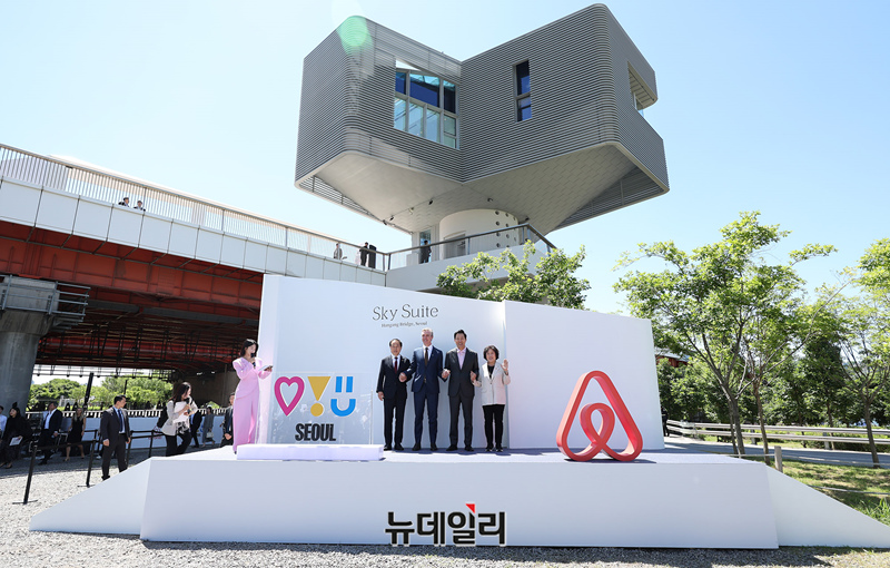 김용호 서울시의원(왼쪽부터), 데이브 스티븐슨 에어비앤비 최고사업책임자, 오세훈 서울시장, 봉양순 서울시의원이 28일 오전 서울 한강대교 북단에 설치된 전망카페에서 열린 '스카이 스위트, 한강브릿지, 서울' 런칭행사에서 기념촬영을 하고 있다.이날 서울시는 에어비앤비와 손잡고 한강 매력에 빠져들 수 있는 특별한 숙박공간 '스카이 스위트'를 공개했다. 이 공간은 한강대교 북단에 설치돼 카페로 이용되다 코로나19로 인해 사용이 중단된 전망카페(직녀카페)를 리모델링해 만들었다.'스카이 스위트'는 실내 144m2 규모로 침실과 거실, 욕실 및 간이주방으로 꾸며졌다. 침실은 노들섬에서 여의도까지 이어지는 한강을 한 눈에 즐길 수 있다. 거실은 도시야경과 함께 유리로 마감된 천장을 통해 하늘을 올려다 볼 수 있다.정식 개관은 7월 16일이다. 예약은 에어비앤비에서 7월 1일 오전 8시부터 가능하다. 서울시는 분기별로 서울시민상 수상자나 소외계층 등을 대상으로 한 무료 숙박 이벤트도 진행할 예정이다.
