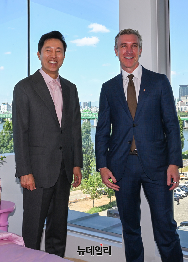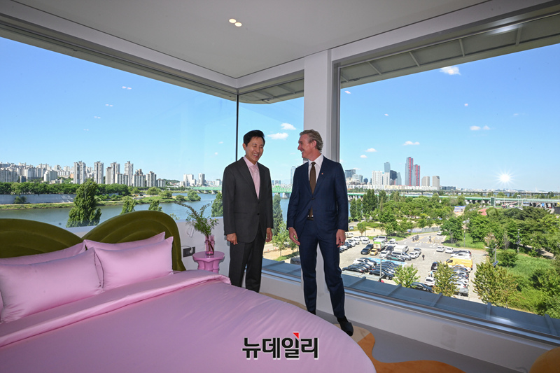 오세훈 서울시장과 데이브 스티븐슨 에어비앤비 최고사업책임자(CBO)가 28일 오전 서울 용산구 '스카이 스위트 한강브릿지 서울(스카이 스위트)'을 찾아 기념촬영을 하고 있다.