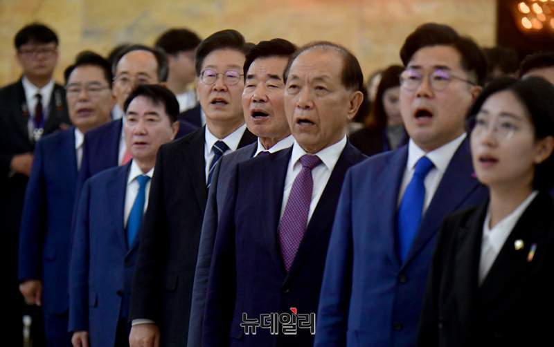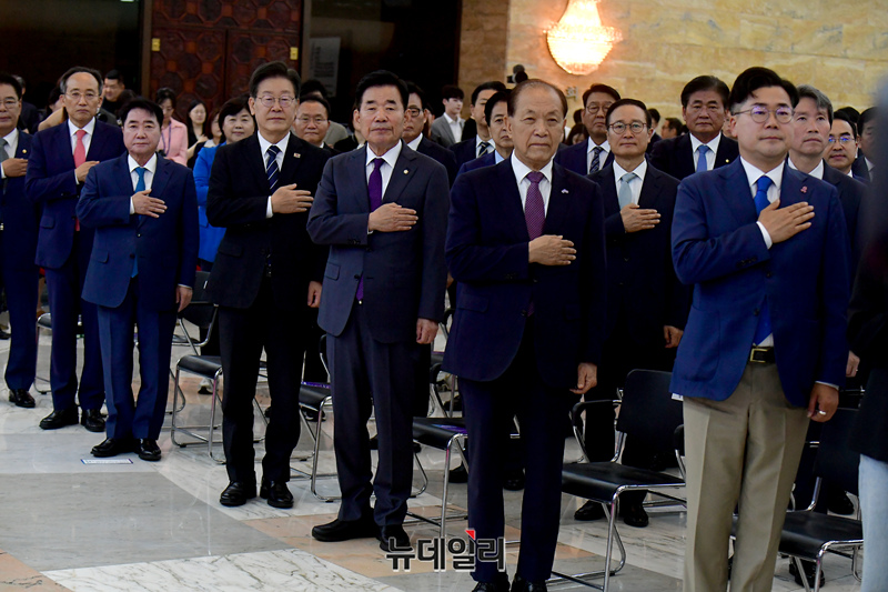 김진표 국회의장이 28일 국회에서 열린 제76주년 국회개원기념식에 참석해 이재명 더불어민주당 대표, 황우여 국민의힘 비상대책위원장 등 참석자들과 국민의례를 하고 있다.