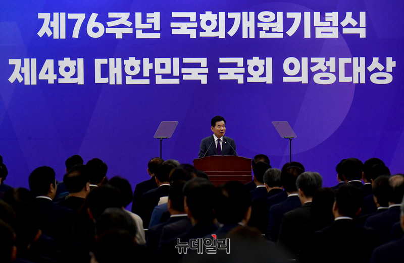 김진표 국회의장이 28일 국회에서 열린 제76주년 국회개원기념식에 참석해 기념사를 하고 있다.