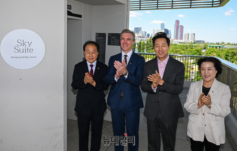 오세훈 서울시장과 데이브 스티븐슨 에어비앤비 최고사업책임자(CBO)가 28일 오전 서울 용산구 '스카이 스위트 한강브릿지 서울(스카이 스위트)'에서 열린 현판식에서 기념촬영을 하고 있다.