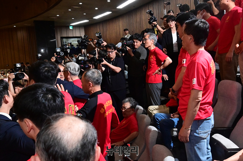 해병대예비역연대 회원들이 28일 오후 국회에서 본 회의에서 '순직 해병 수사 방해 및 사건 은폐 등의 진상 규명을 위한 특별검사의 임명 등에 관한 법률안 재의의 건'이 부결되자 고성을 지르며 항의를 하고 있다.