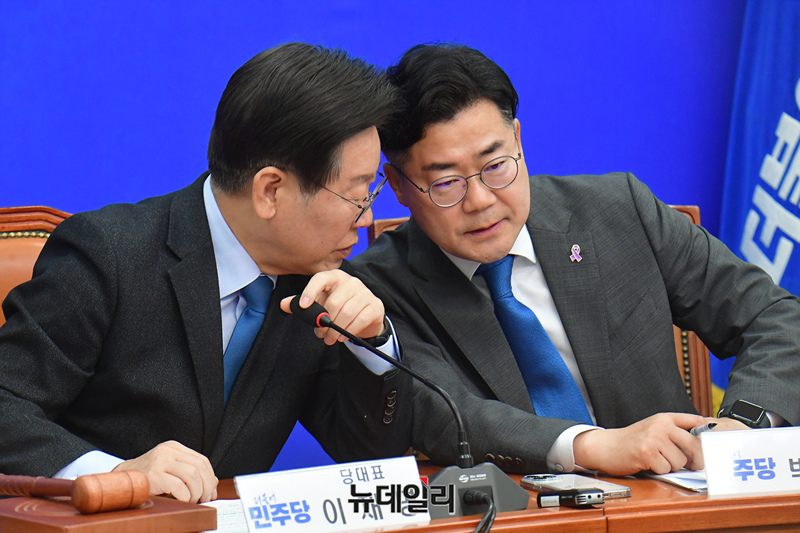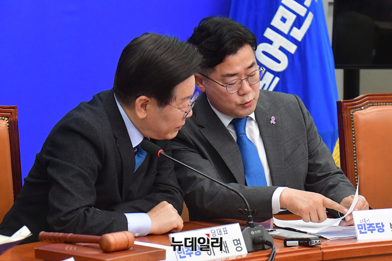 이재명 더불어민주당 대표가 29일 국회에서 열린 최고위원회의에서 박찬대 원내대표와 대화하고 있다.