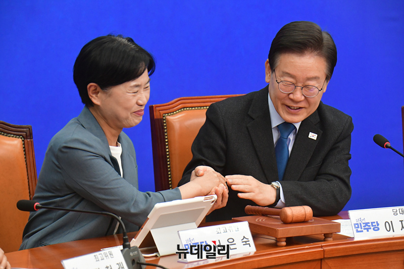 이재명 더불어민주당 대표가 29일 국회에서 열린 최고위원회의에서 임기 마지막 날인 최은숙 최고위원 손을 잡고 격려하고 있다.