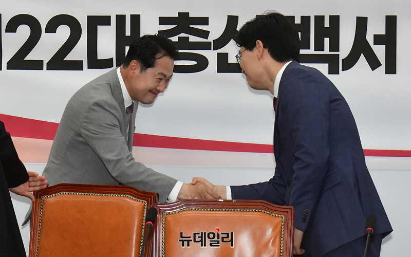 [포토] 인사 나누는 조정훈 국민의힘 총선백서 특위 위원장