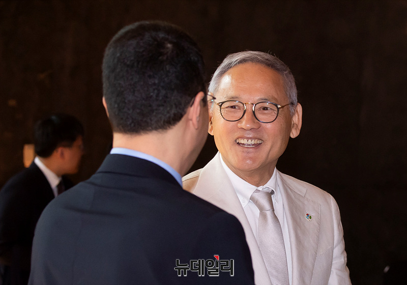 유인촌 문화체육관광부 장관이 30일 오전 서울 여의도 콘래드 호텔에서 열린 '2024 국제저작권관리단체연맹 세계 총회(CISAC)'에 참석하며 관계자와 인사를 나누고 있다.국제저작권관리단체연맹(CISAC)은 전 세계 116개국 225개의 저작권 단체를 회원국으로 두고 작가, 작곡가, 창작자의 권리를 보호하고 저작권 관리 단체 간 협력을 촉진하는 국제 연합체다.20년만에 한국에서 유치된 이번 총회는 다음달 1일까지 여의도 콘래드 호텔에서 진행된다.