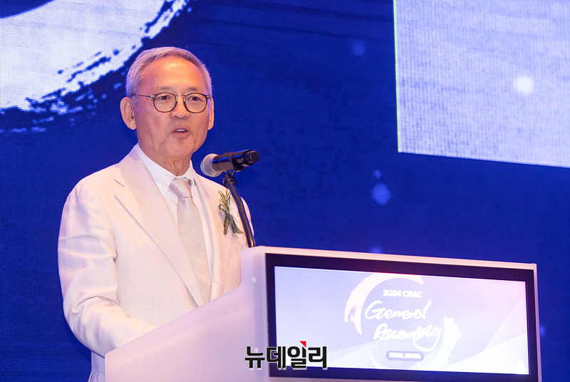 유인촌 문화체육관광부 장관이 30일 오전 서울 여의도 콘래드 호텔에서 열린 '2024 국제저작권관리단체연맹 세계 총회(CISAC)'에서 환영사를 하고 있다.