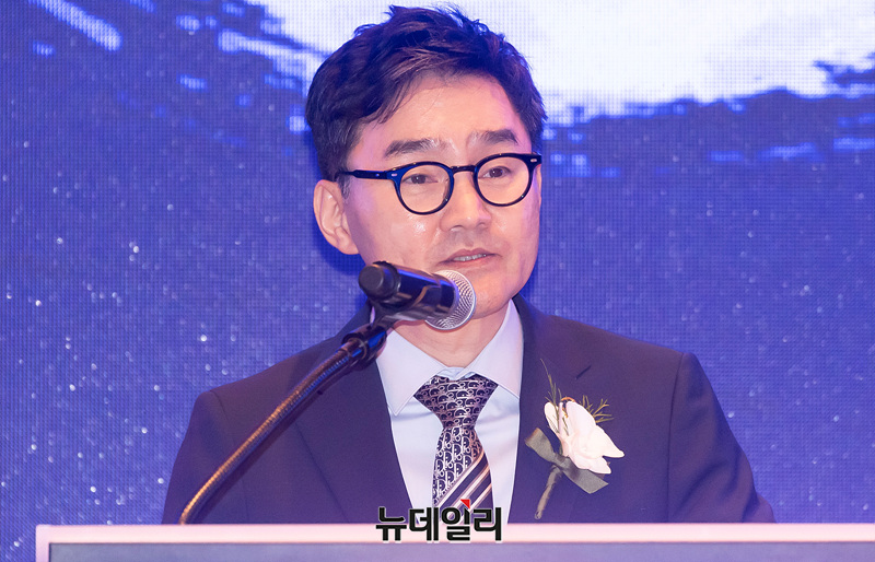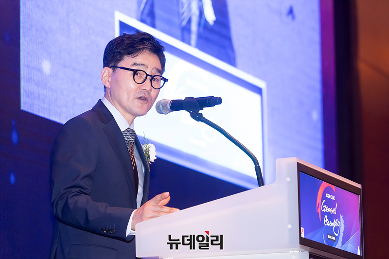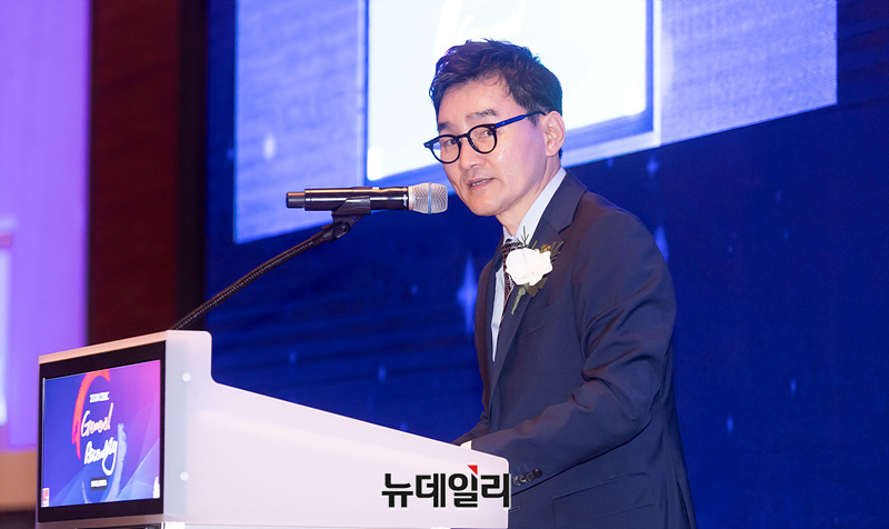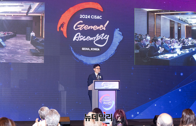 추가열 한국음악저작권협회장이 30일 오전 서울 여의도 콘래드 호텔에서 열린 '2024 국제저작권관리단체연맹 세계 총회(CISAC)'에서 축사를 하고 있다.