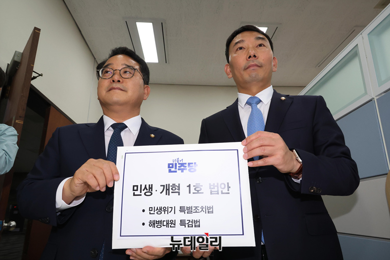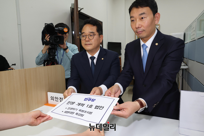 22대 국회 개원 첫날인 30일 오후 국회 의안과에 더불어민주당 민병대, 김용민 의원이 더불어민주당 당론 1호 법안인 '해병대 특검법, 민생위기 특별 조치법'을 제출하고 있다.