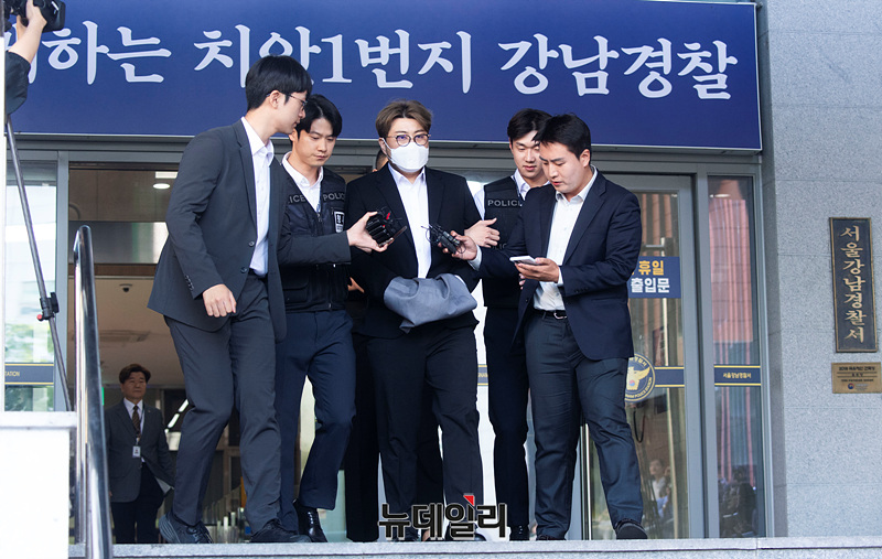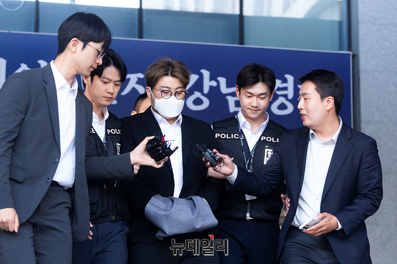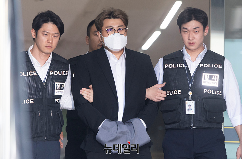 음주 뺑소니 혐의를 받는 가수 김호중이 31일 오전 서울 강남구 강남경찰서에서 검찰로 구속 송치되고 있다.