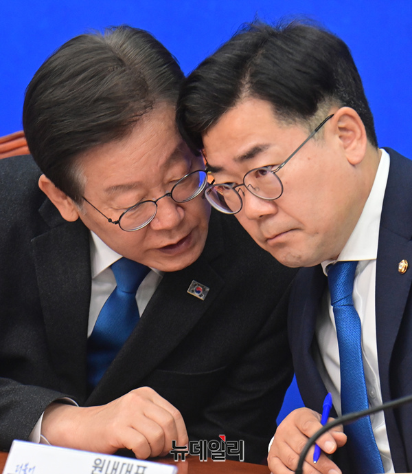 이재명 더불어민주당 대표가 29일 오전 국회에서 열린 최고위원회의에서 박찬대 원내대표와 대화를 나누고 있다.