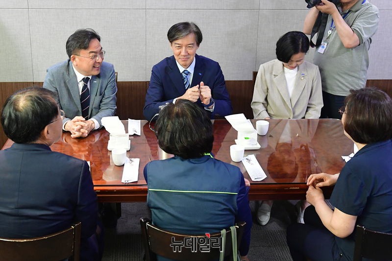 조국 조국혁신당 대표가 31일 오전 국회 의원회관에서 열린 국회청소노동자 오찬 간담회에서 참석자들과 대화를 나누고 있다.