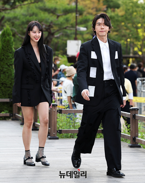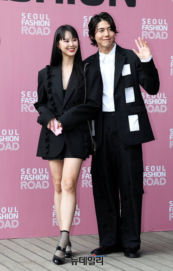 배우 송재희, 지소연 부부가 31일 오후 서울 송파구 석촌호수 아뜰리에에서 열린 '서울패션로드 2024' 포토월에서 포즈를 취하고 있다.