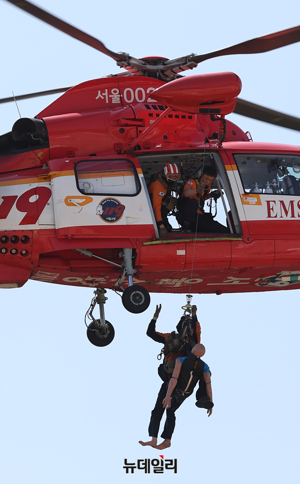 5월 마지막 날인 31일 오후 서울 탄천공영주차에서 열린 '2024년 강남구 안전한국훈련'에서 소방헬기가 인명구조를 하고 있다.