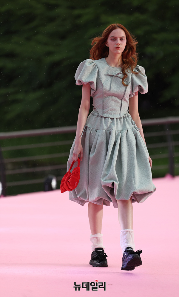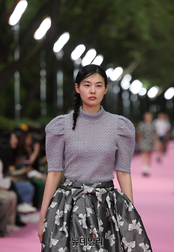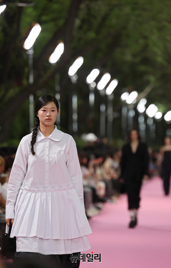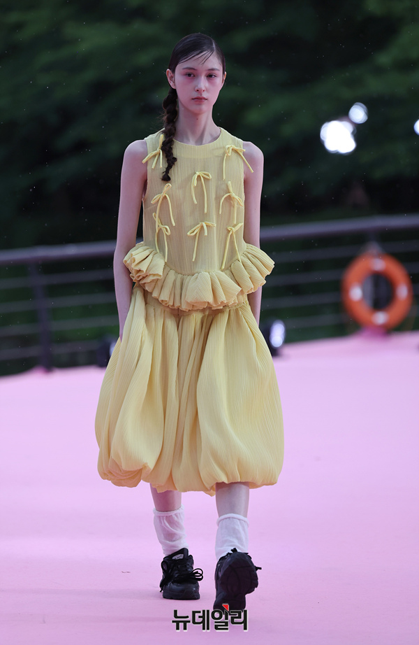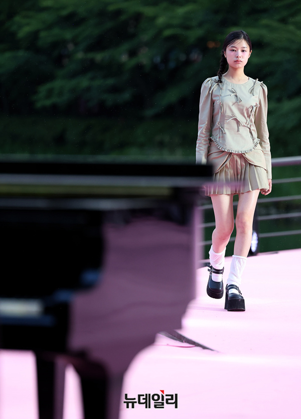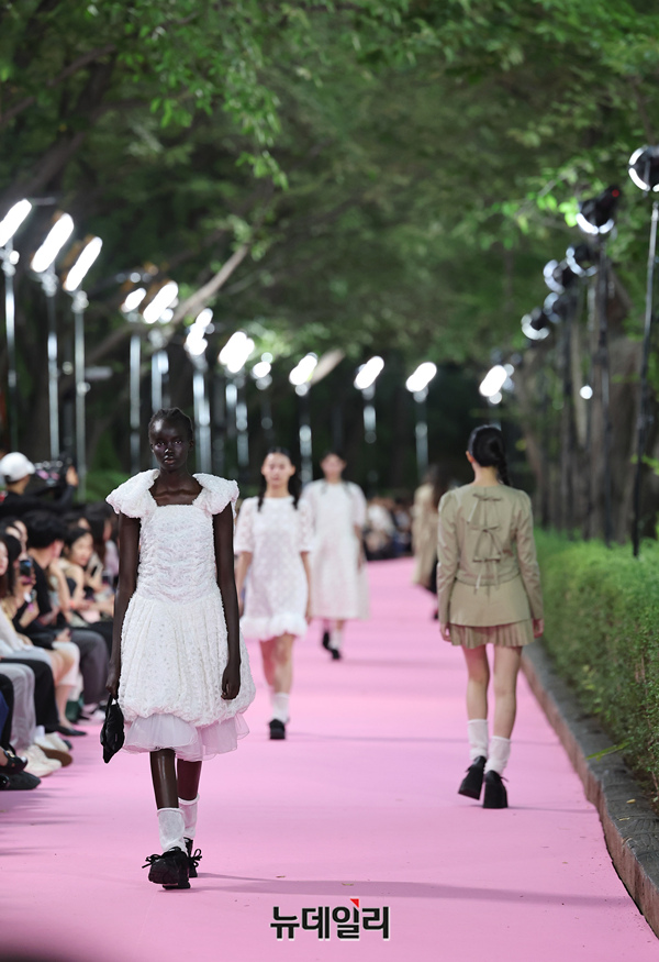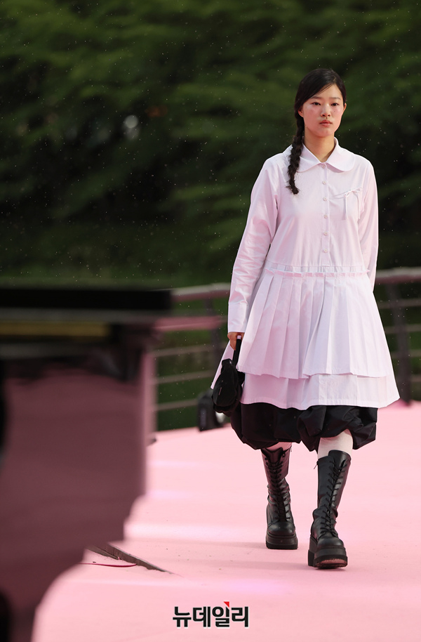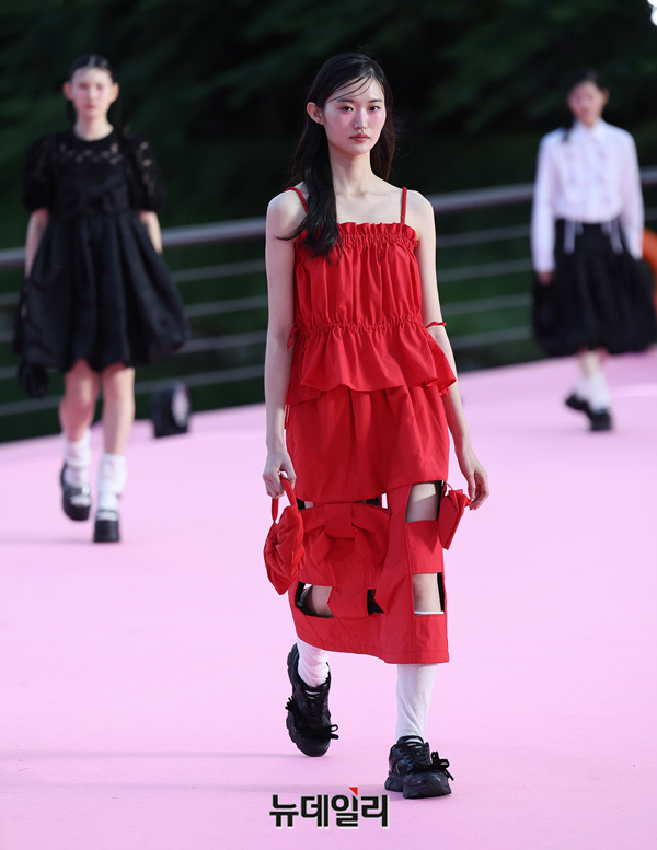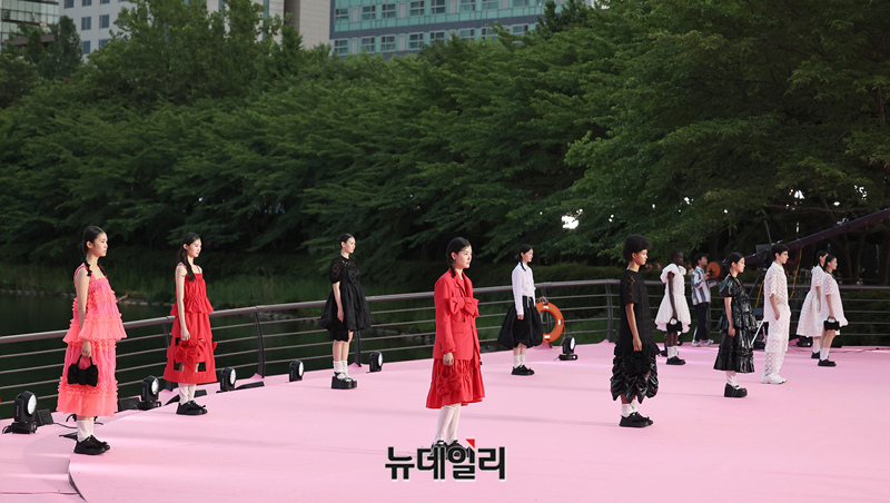 서울시가 5월 마지막날인 31일 오후 서울 송파구 석촌호수 서호 수변무대에서 서울패션로드 첫 행사를 열고 250m 산책로에서 런웨이를 선보이고 있다. 서병문, 엄지나 디자이너의 뷔미에트가 '아름다운 악몽' 컨셉으로 몽환전인 컬렉션을 선보이고 있다.서울패션로드는 서울시가 K-패션의 매력을 알려 '글로벌 패션도시'로 거듭나기 위해 마련한 행사다. 250m 석촌호수 산책로 위에 스카이코랄빛 카펫을 깔아 로맨틱한 런웨이로 마련했다.이날 행사는 클래식 사전 공연을 시작으로 3개의 글로벌 유망 디자이너 브랜드(뮌, 분더캄머, 비뮈에트)의 패션쇼가 진행됐다.
