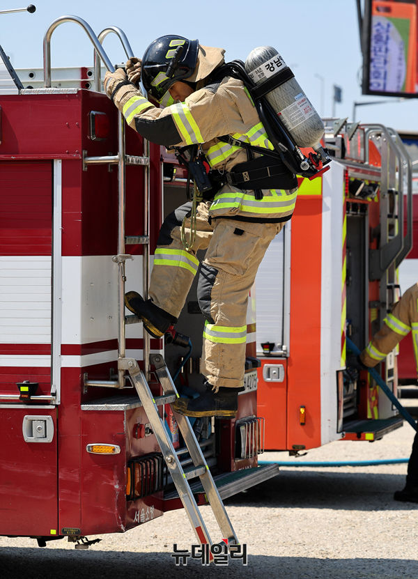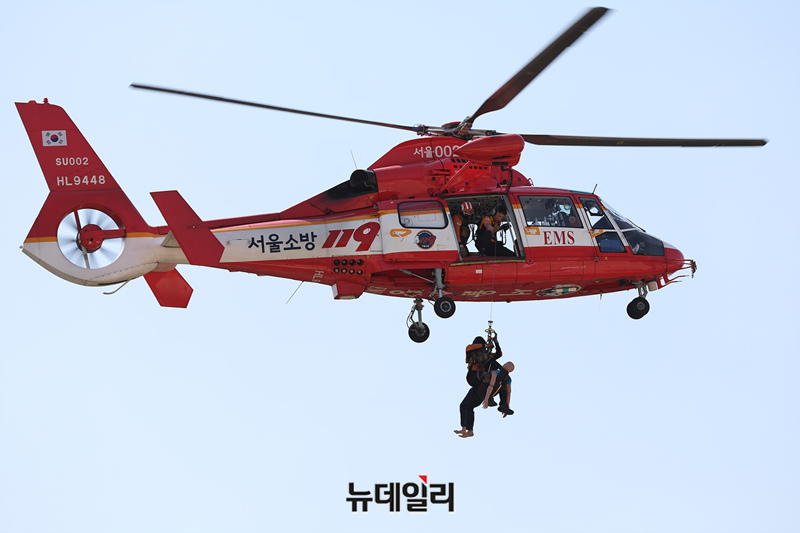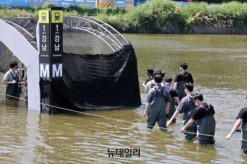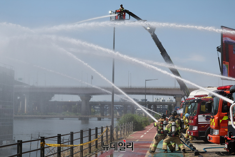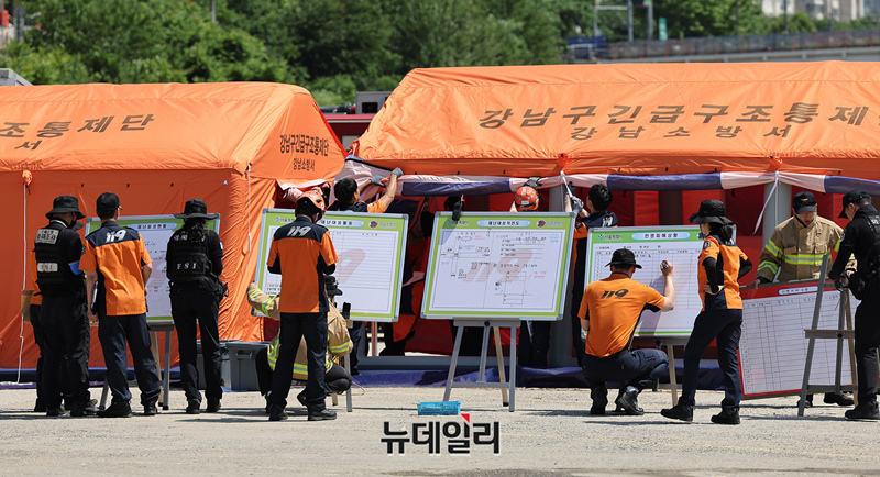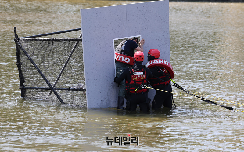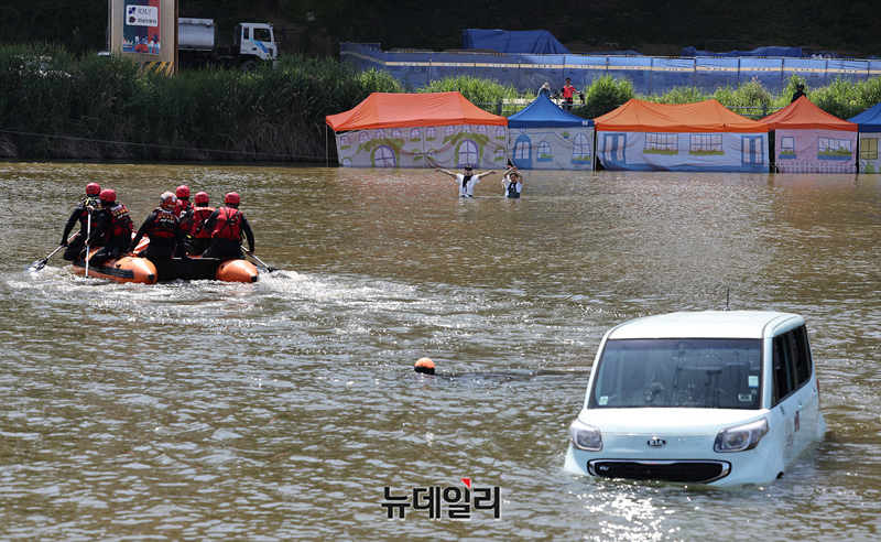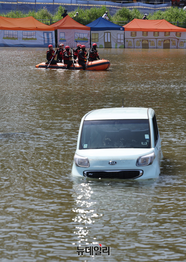 5월 마지막 날인 31일 오후 서울 탄천공영주차에서 열린 '2024년 강남구 안전한국훈련'에서 강남역 침수상황을 대비한 훈련을 하고 있다.