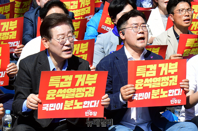 이재명 더불어민주당 대표 박찬대 원내대표 및 참석자들이 1일 오후 서울 중구 서울역 인근에서 열린 윤석열정권 규탄 및 해병대원 특검법 관철을 위한 범국민대회에서 구호를 외치고 있다.