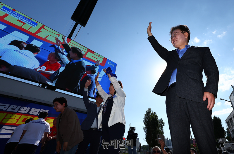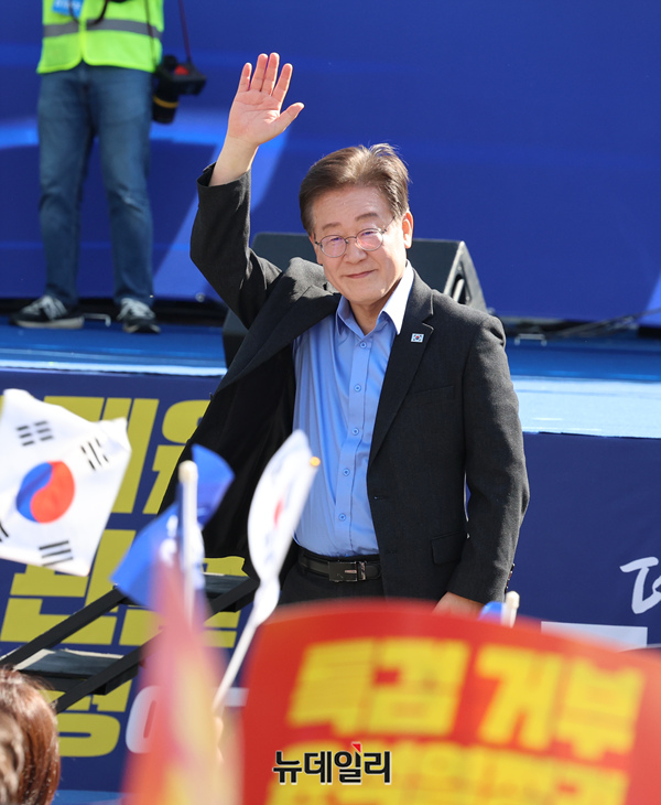 이재명 더불어민주당 대표가 1일 오후 서울 중구 서울역 인근에서 열린 윤석열정권 규탄 및 해병대원 특검법 관철을 위한 범국민대회에서 발언을 하기에 앞서 손들어 인사하고 있다.