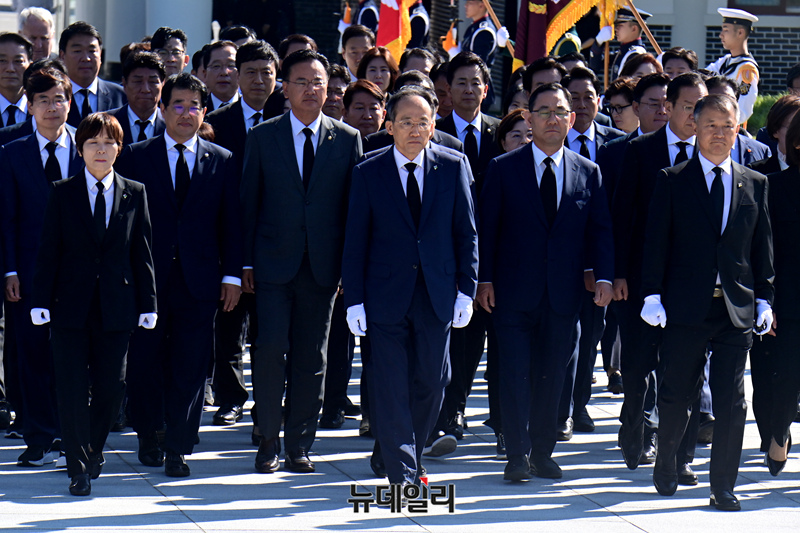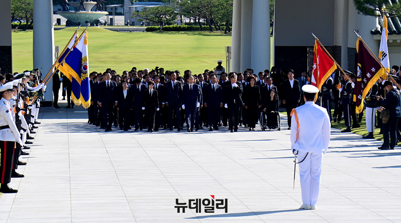 추경호 국민의힘 원내대표와 소속 의원들이 3일 서울 동작구 국립서울현충원을 찾아 참배를 하고 있다.