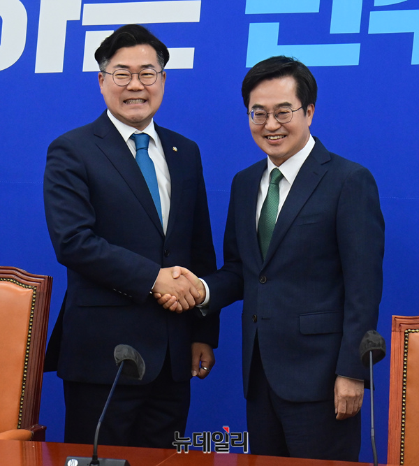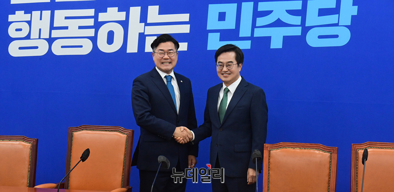 김동연 경기도지사가 3일 오전 국회에서 박찬대 더불어민주당 원내대표를 만나 기념촬영을 하고 있다.