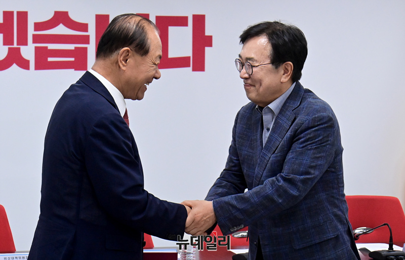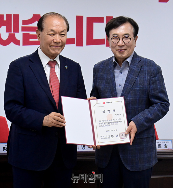 황우여 국민의힘 비상대책위원장이 3일 오호 서울 여의도 중앙당사에서 열린 제4차 전당대회 선거관리위원회 임명장 수여식 및 1차회의에서 서병수 선거관리위원장에게 임명장을 수여하고 있다.