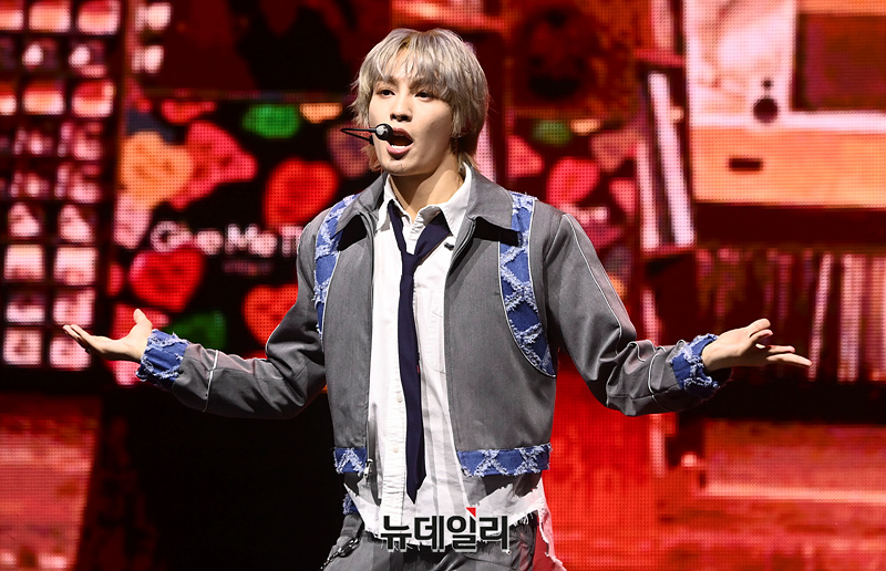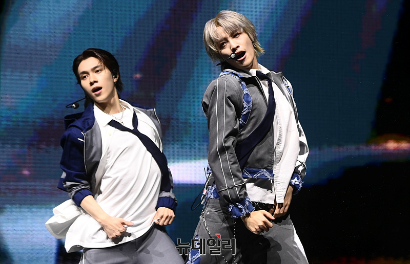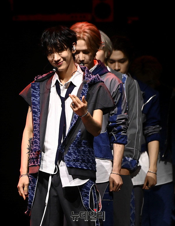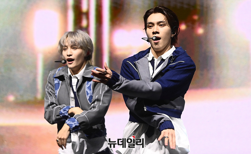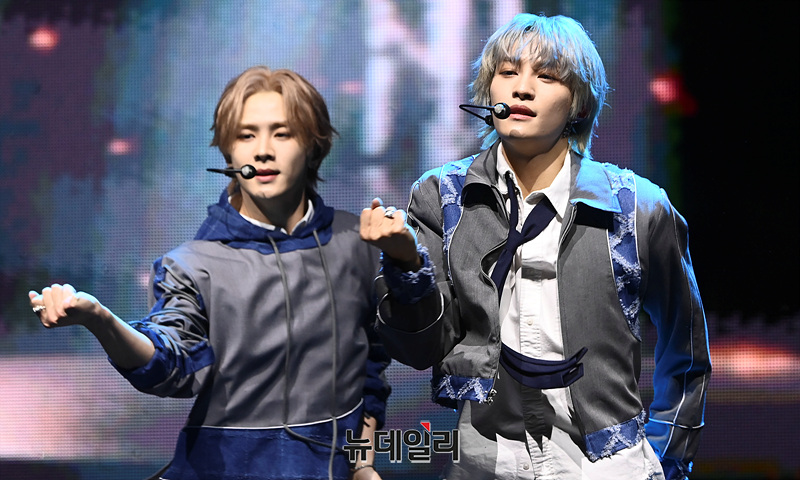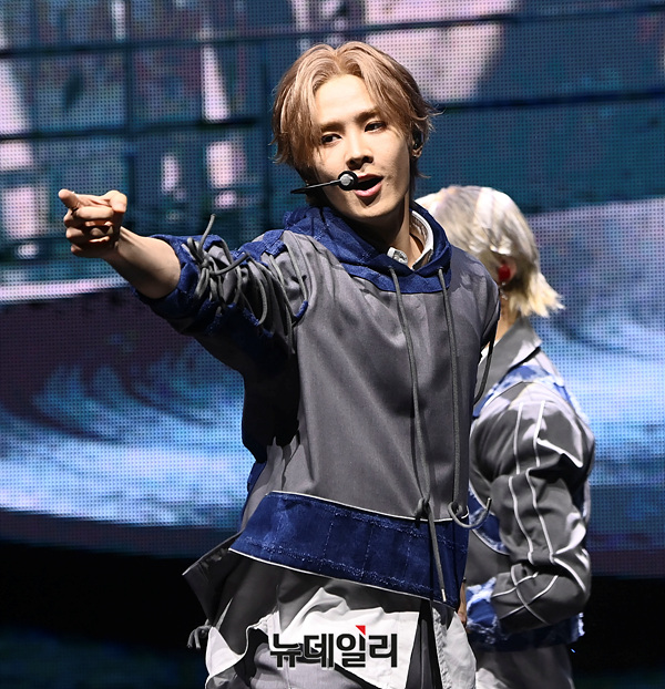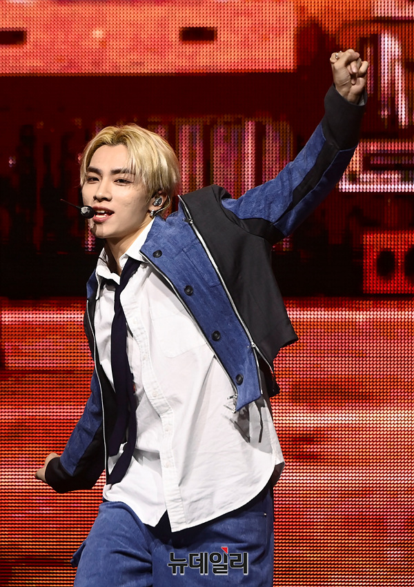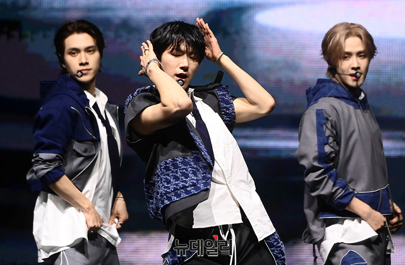 그룹 웨이션브이(WayV) 샤오쥔(왼쪽부터), 쿤, 텐, 양양, 헨드리가 3일 오후 서울 용산구 블루스퀘어에서 열린 다섯 번째 미니앨범 '기브 미 댓(Give me That)' 발매 기념 미디어 쇼케이스에서 무대를 선보이고 있다.