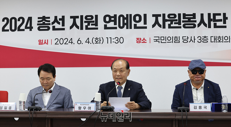 황우여 국민의힘 비상대책위원장이 4일 오전 서울 여의도 국민의힘 중앙당사에서 열린 '2024 총선 지원 연예인 자원봉사단 간담회'에서 인사말을 하고 있다.