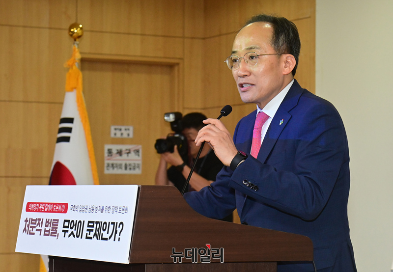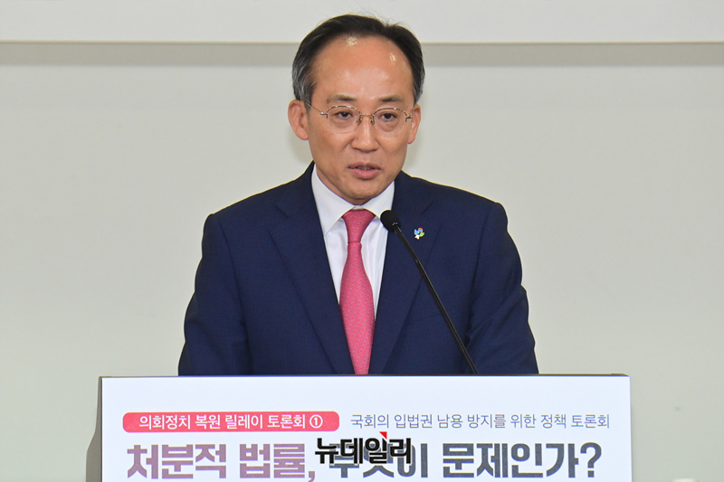 추경호 국민의힘 원내대표가 4일 오후 국회 의원회관에서 열린 '처분적 법률, 무엇이 문제인가' 토론회에서 축사를 하고 있다.