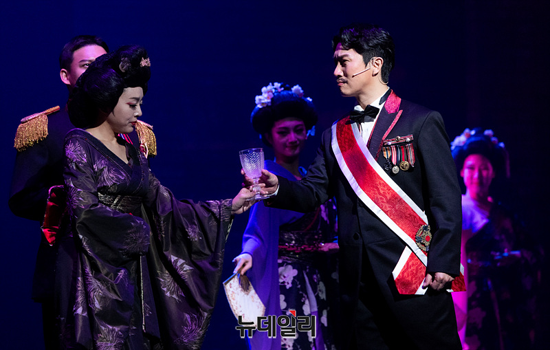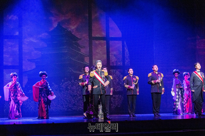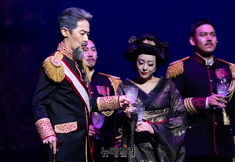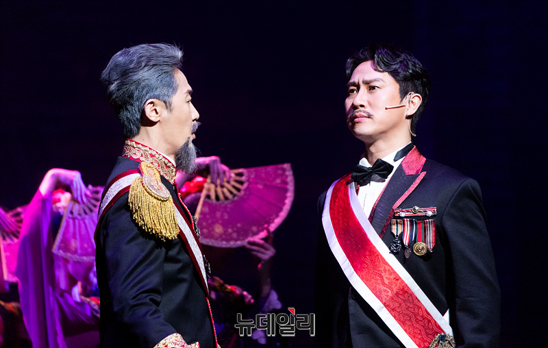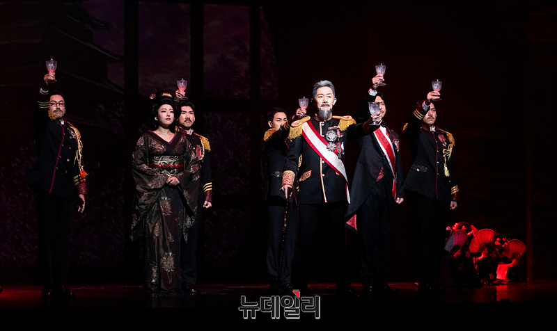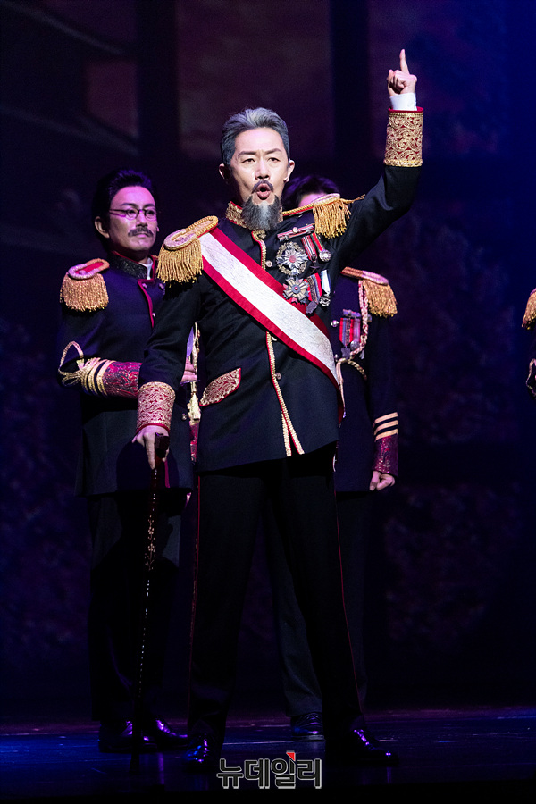배우 서영주, 조영태, 고운과 조연 배우들이 4일 오후 서울 종로구 세종문화회관 대극장에서 열린 뮤지컬 '영웅' 프레스콜에서 무대를 선보이고 있다.