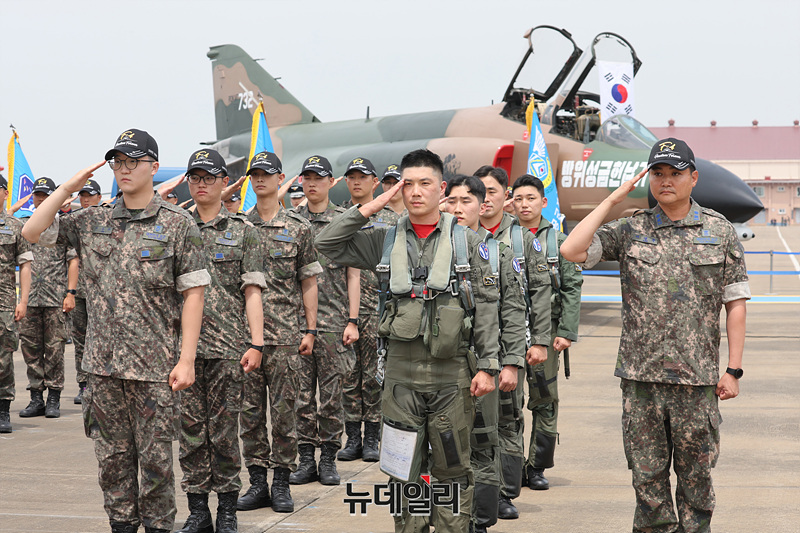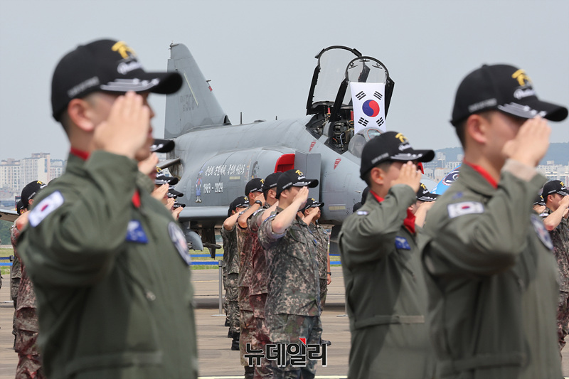 공군 장병들과 조종사들이 7일 오전 경기 수원공군기지에서 열린 'F-4E 팬텀 퇴역식'에서 거수경례를 하고 있다. (사진=공동취재단)