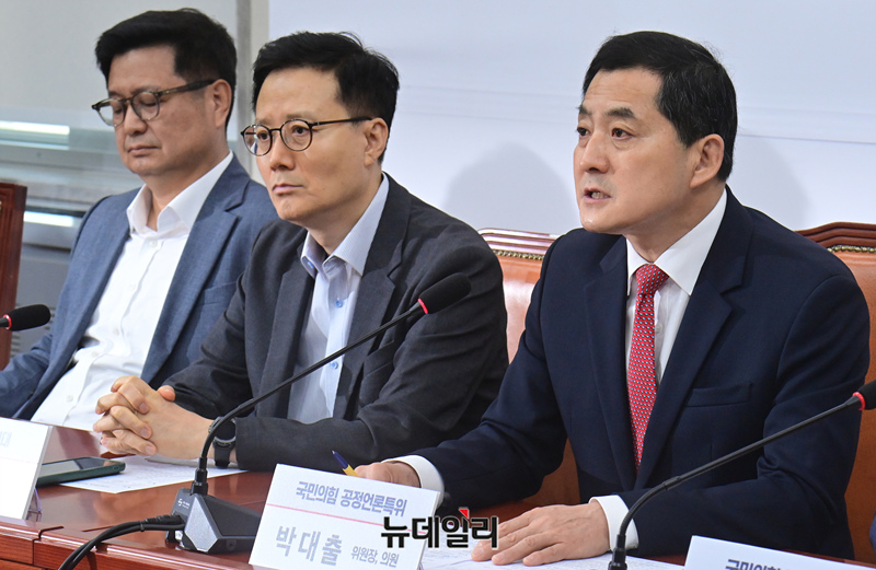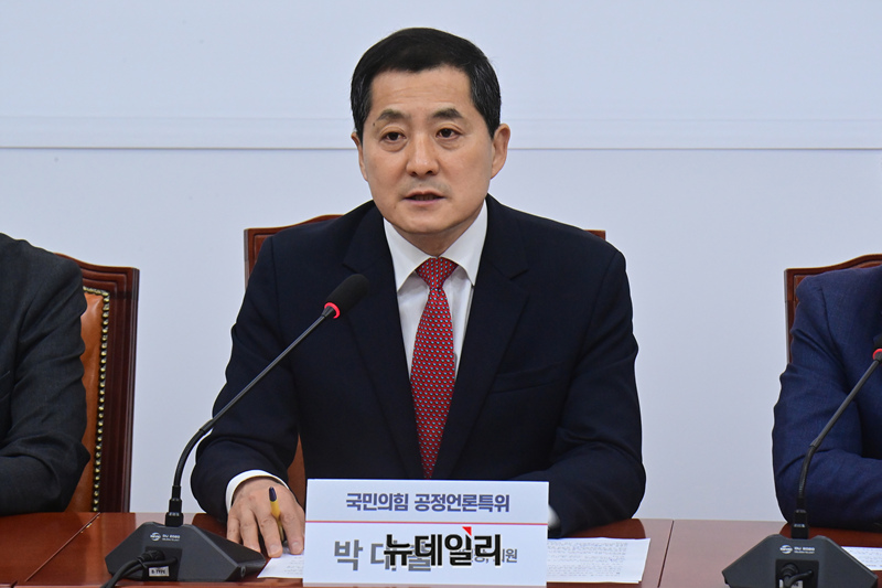 박대출 국민의힘 공정언론특위 위원장이 10일 오전 국회에서 열린 민주당·민노총 '방송장악3법' 저지를 위한 연석회의에서 발언하고 있다.